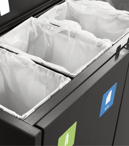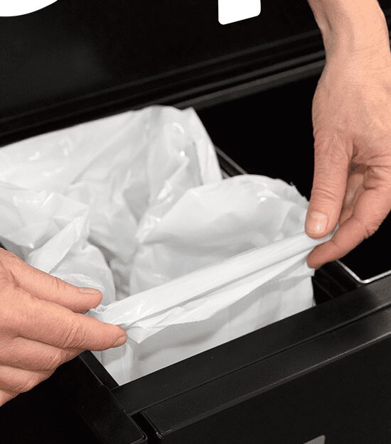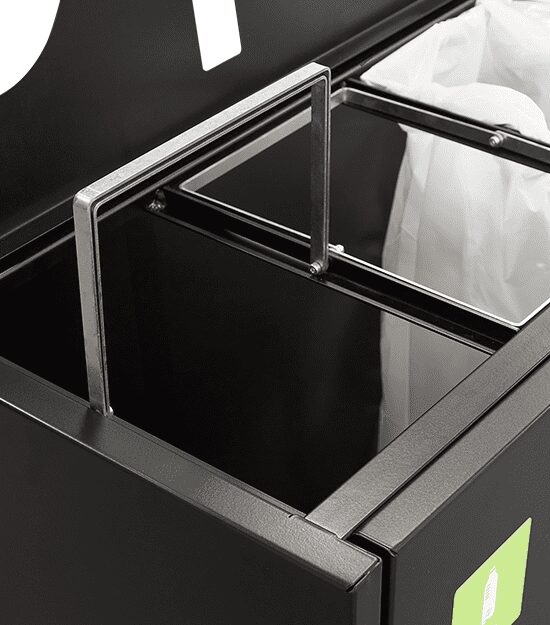 Affaldspanden er udstyret med åbning i fronten for ergonomisk korrekt tømning. Poseringe anvendes til let og præcis fastgørelse af affaldsposen, så det er let for personalet at tømme spanden. Passer til standardposer.