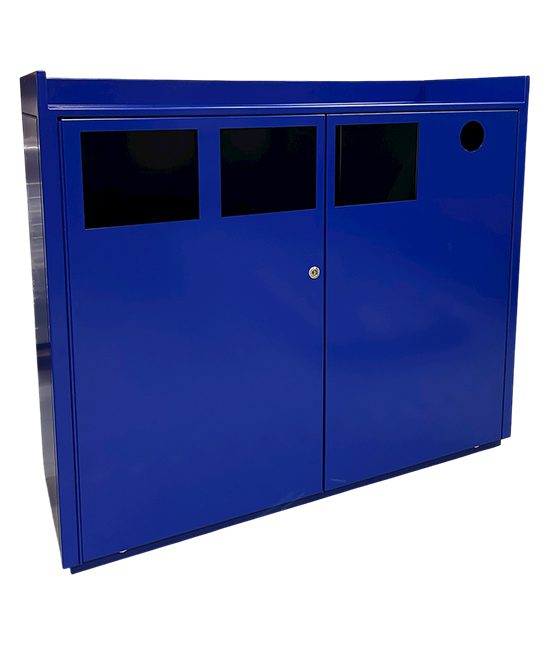 FD Roof XXL 142×40 med fladt tag til afsætning af bakker er vores robuste affaldssorteringssystem til kantiner, food halls og restauranter. Affaldsspanden har fladt tag og indkast fra siden. Udformningen på spandens indkast kan tilpasses jeres behov ligesom farve og tekster tilpasses jeres omgivelser.